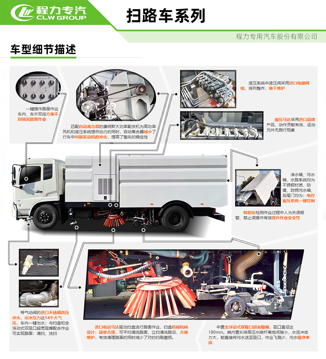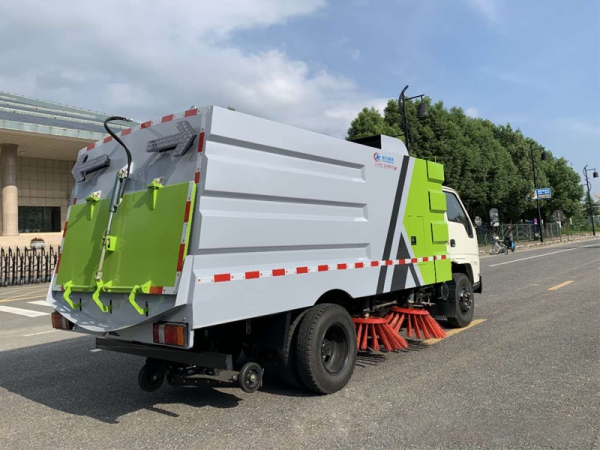帶掃盤4把,江鈴副發動機;大力馬達;施耐德控件開關;臺灣電磁閥組;免維護自分離式離合器;免維護風機;不銹鋼水箱;不銹鋼垃圾箱;尾部LED箭頭燈;手動泵應急系統;刷臂轉動機構使用高新耐磨工程隔套,免打黃油;精密冷彎無縫液壓油管。